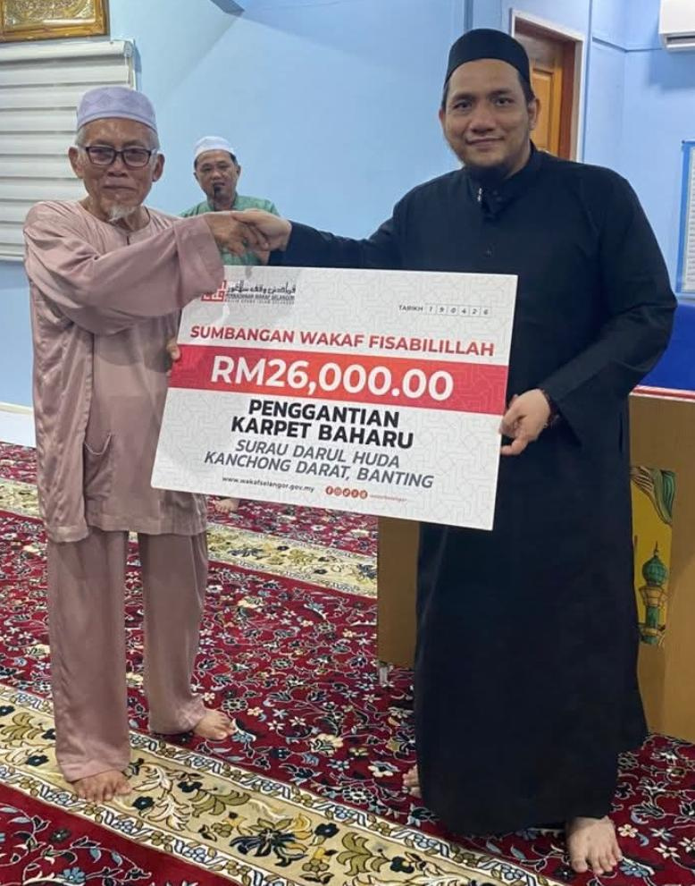 BantingPerbadanan Wakaf Selangor terus memperkukuh agenda pemerkasaan institusi masjid dan surau melalui penyaluran sumbangan Wakaf Fisabilillah berjumlah RM26,000.00 bagi tujuan penggantian karpet baharu di Surau Darul Huda, Kanchong Darat.